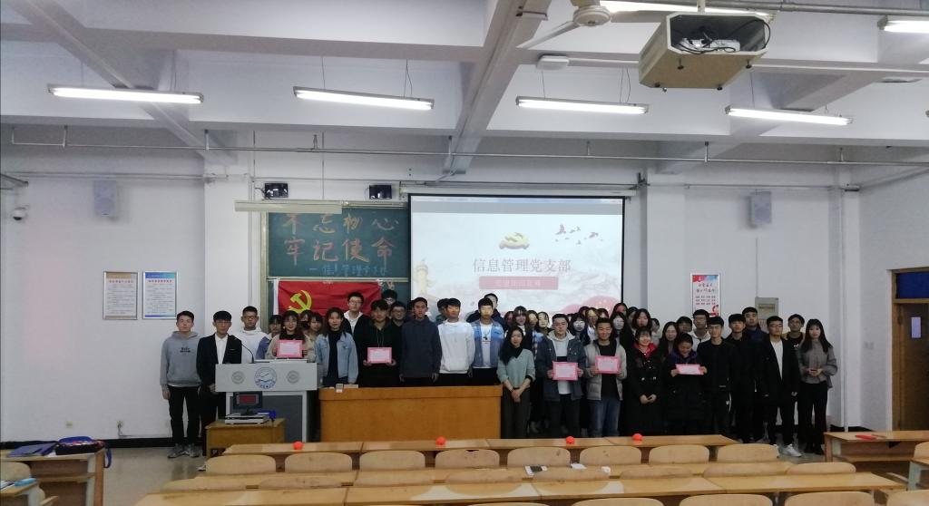 为在“不忘初心、牢记使命”主题教育中进一步做好“开门抓教育”,促进党团共建,bat365在线中国官网登录入口信息管理党支部于2019年11月14日在逸夫楼B303教室举办“不忘初心,牢记使命”主题教育知识竞赛总决赛。信息管理党支部成员及120余名同学观看本次比赛。