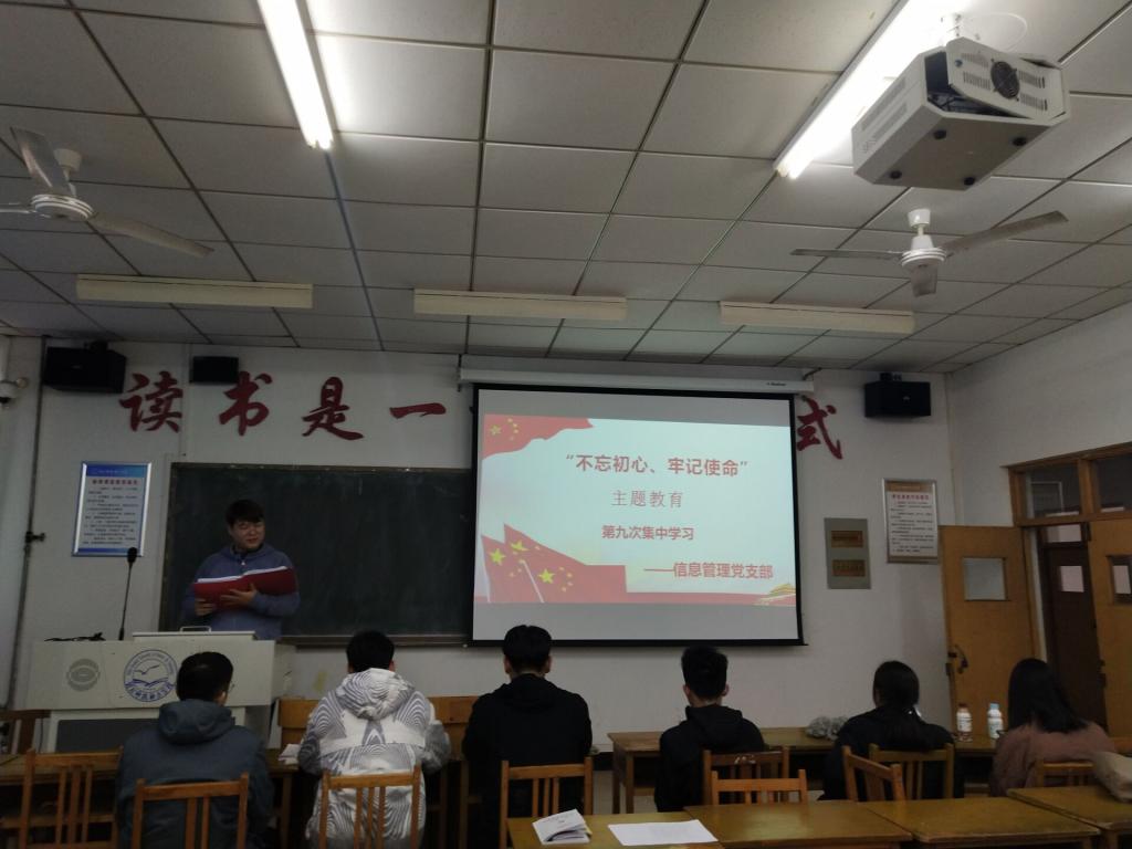 bat365在线中国官网登录入口信息管理党支部于2019年11月21日在逸夫楼A510进行了“不忘初心,牢记使命”主题教育第九次集体学习。