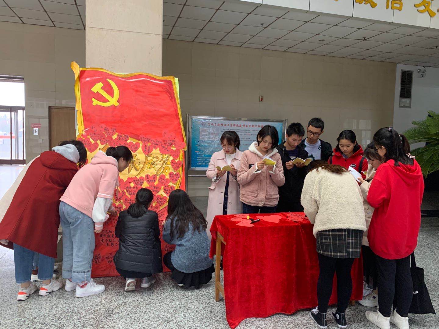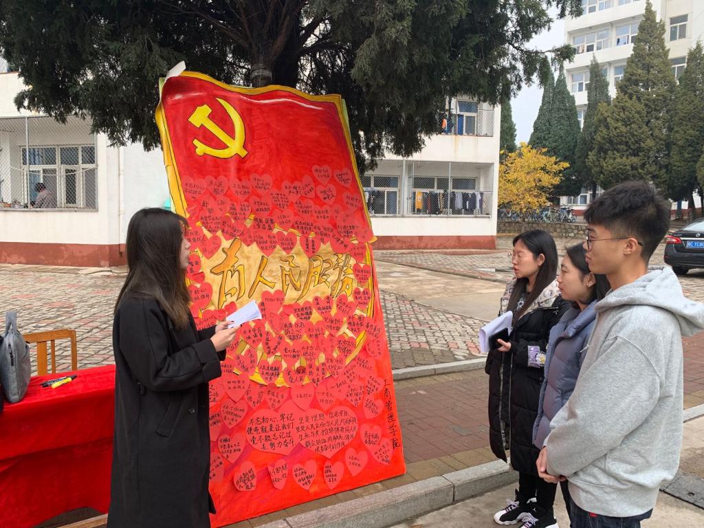 2019年11月9日-10日,信息管理党支部学生党员手持“不忘初心,牢记使命”主题教育学生手册向教学楼里及校园里来往的同学们讲解应知应会相关知识,使更多的同学对“不忘初心,牢记使命”主题教育有进一步认识,并号召同学们一起向党言心志, “我将以赤诚之心紧跟党走”、“传承党训,砥砺前行”、“守其初心,始终不变,小水长流,则能穿石”,“这是一个伟大的时代,涓涓努力都向着大海涌流”、“不忘初心牢记使命将青年梦融入中国梦”……