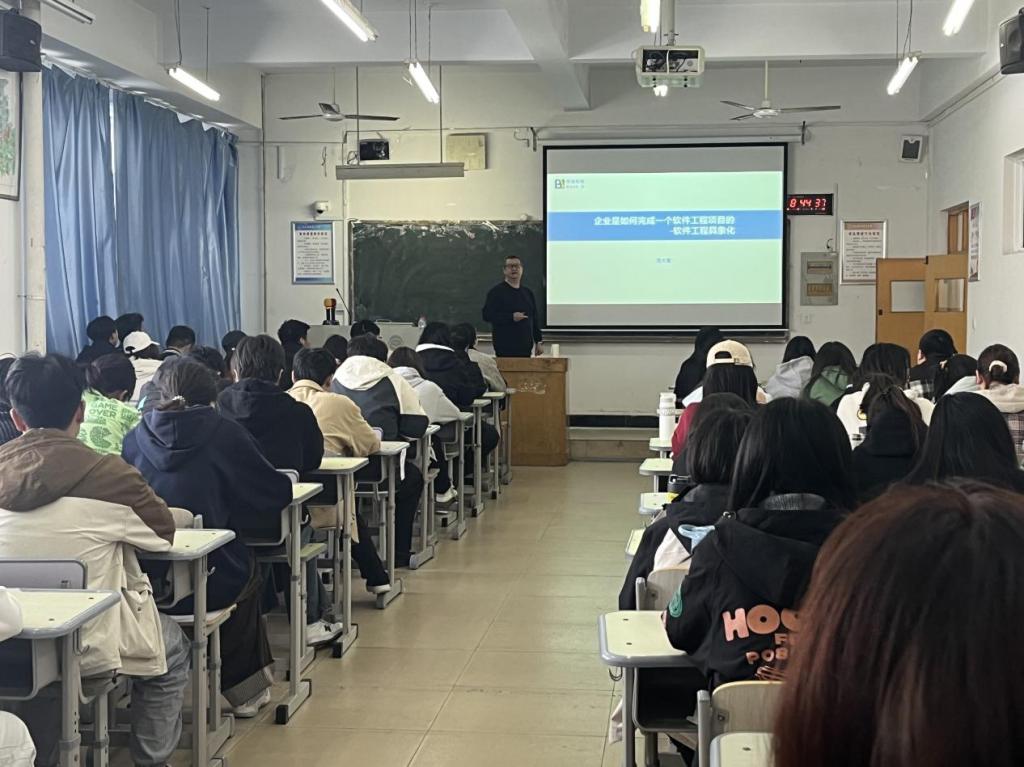 在讲座过程中,贾总经理通过诙谐生动的语言、图文并茂的幻灯片、丰富翔实的案例给大家呈现了软件工程项目的论证规划、分析设计、开发实施及售后运维等全生命周期的各个环节中细节及要点,学生们反响热烈,纷纷反映获益良多。