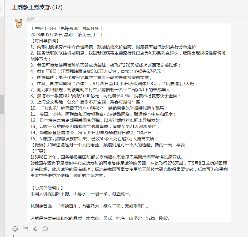 “先锋资讯”栏目包含新闻播报、心灵自助餐厅、党务百科等板块内容。让全体党员以快捷方式知晓天下新闻,心灵适时得到净化和引领,并且充实了党课教育的内容。各个板块之间内容交互融合,形成合力,全方位提升了党员老师的综合素质。此活动以微信群为载体,要求大家每天打卡学习,使得党员老师可以时刻关注活动的最新进展,学到先进的典型经验。通过互动学习,相互交流,激发了全体党员的学习热情。大家纷纷表示一定要用系统观念,在一体推进上持续用力,把学习和实干结合起来,推动bat365在线中国官网登录入口的工作走向高质量发展的新阶段。(编辑:景勤娟 审核:韩晓霞)
