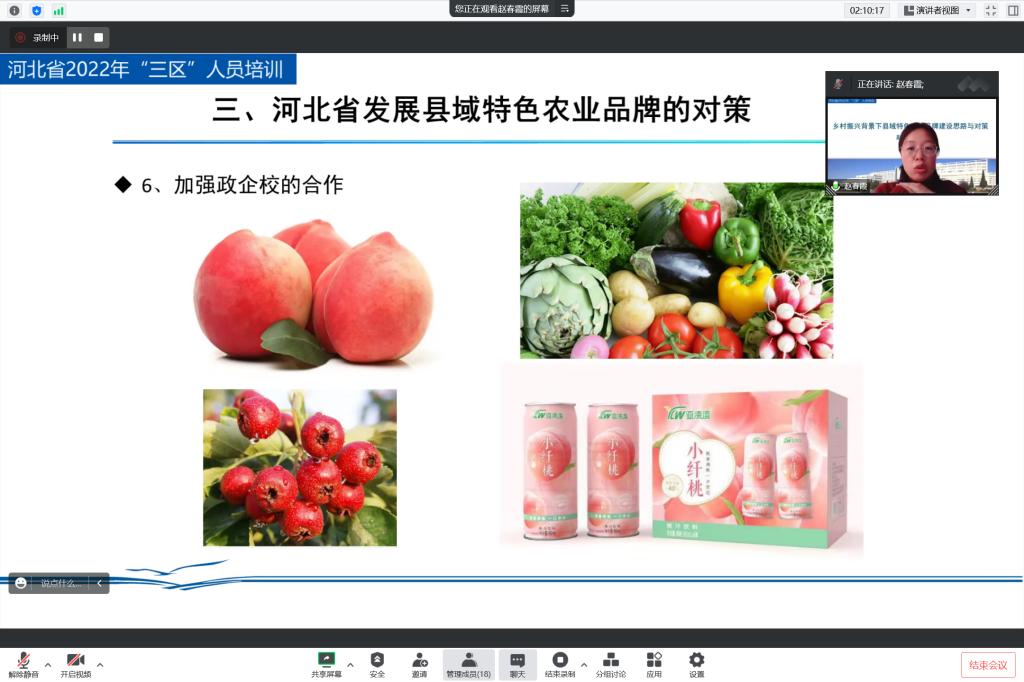 2022年11月18日,bat365市场营销教学部专业带头人赵春霞博士受邀为我校承办的“河北省2022年三区科技人员培训班”进行了“乡村振兴背景下县域特色农业品牌建设思路与对策”的线上讲座。