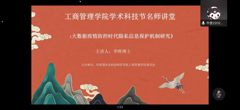 李晖博士以《大数据疫情防控时代隐私信息保护机制》为题,从数智时代的含义、后疫情时代生活方式的改变、提升个人保护意识等方面为同学们普及科技创新知识,同时李老师针对哲学社会科学类学术论文的撰写方法进行讲解,从选题、数据统计、社会贡献度等方面讲解了如何将自然科学与社会科学有机结合从而提升学术论文水平为社会发展做贡献。