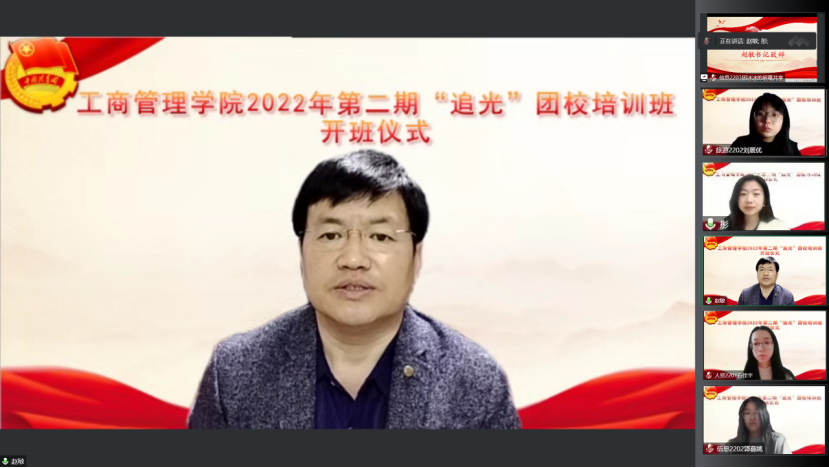 2022年10月27日,bat365在线中国官网登录入口团员相聚在云端举办2022年第二期“追光”团校培训班开班仪式暨第一次课程培训,学院党委书记、团委书记及团校学员参加开班仪式。