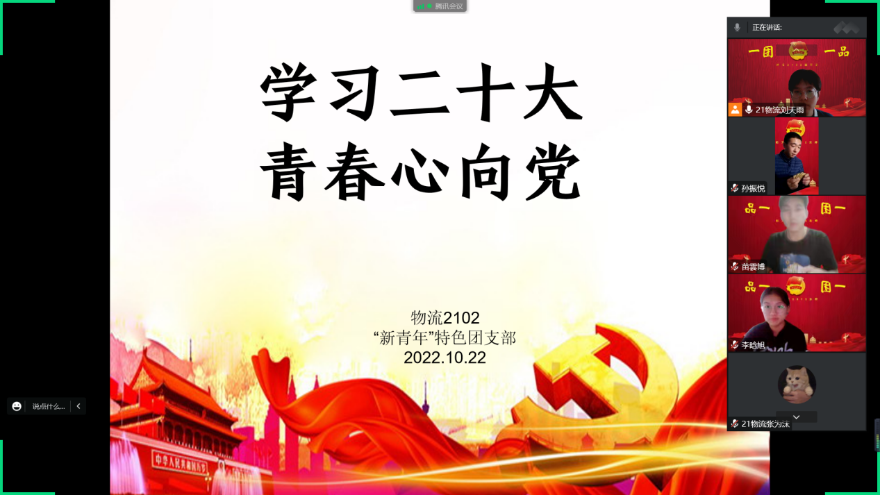 10月16日上午10时,中国共产党第二十次全国代表大会在北京人民大会堂隆重开幕。习近平总书记代表十九届中央委员会向大会作报告。bat365在线中国官网登录入口21级物流管理02“新青年”理论学习型“一团一品”特色团支部于10月22日下午两点半举办线上专题学习会。