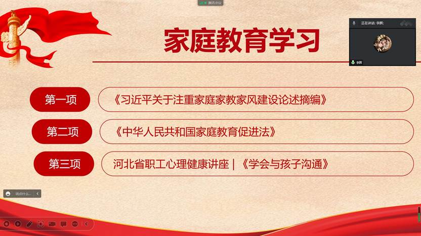 本次活动由bat365在线中国官网登录入口分工会主席韩晓霞主持。为了带动每个家庭培养良好的家风,韩晓霞主席带领大家共同学习《习近平关于注重家庭家教家风建设论述摘编》、《中华人民共和国家庭教育促进法》、《河北省职工心理健康讲座-学会与孩子沟通》等内容,引导大家树立良好的文明家风,文明育家、廉洁持家、学习兴家、绿色美家,培育向上向善的优良家风,以好家风涵养好社风。