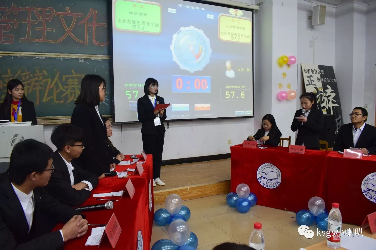 经过初赛、复赛的层层选拔,共有四个班级进入决赛阶段。决赛分为两场进行,以“企业发展更需要全面型人才---企业发展更需要专业型人才”和“合作比竞争更能使礼貌进步---竞争比合作更能使礼貌进步”为题展开辩论。参赛选手以吸引观众为切入点,通过盘问、驳论、对辩等方式进行比赛。总结陈词环节,双方辩手清晰的思路和巧妙的陈词给观众留下了深刻印象;自由辩论环节,双方辩手精辟的措辞、犀利的言辞,引得观众阵阵叫好。比赛现场氛围激烈,场下观众掌声不断。