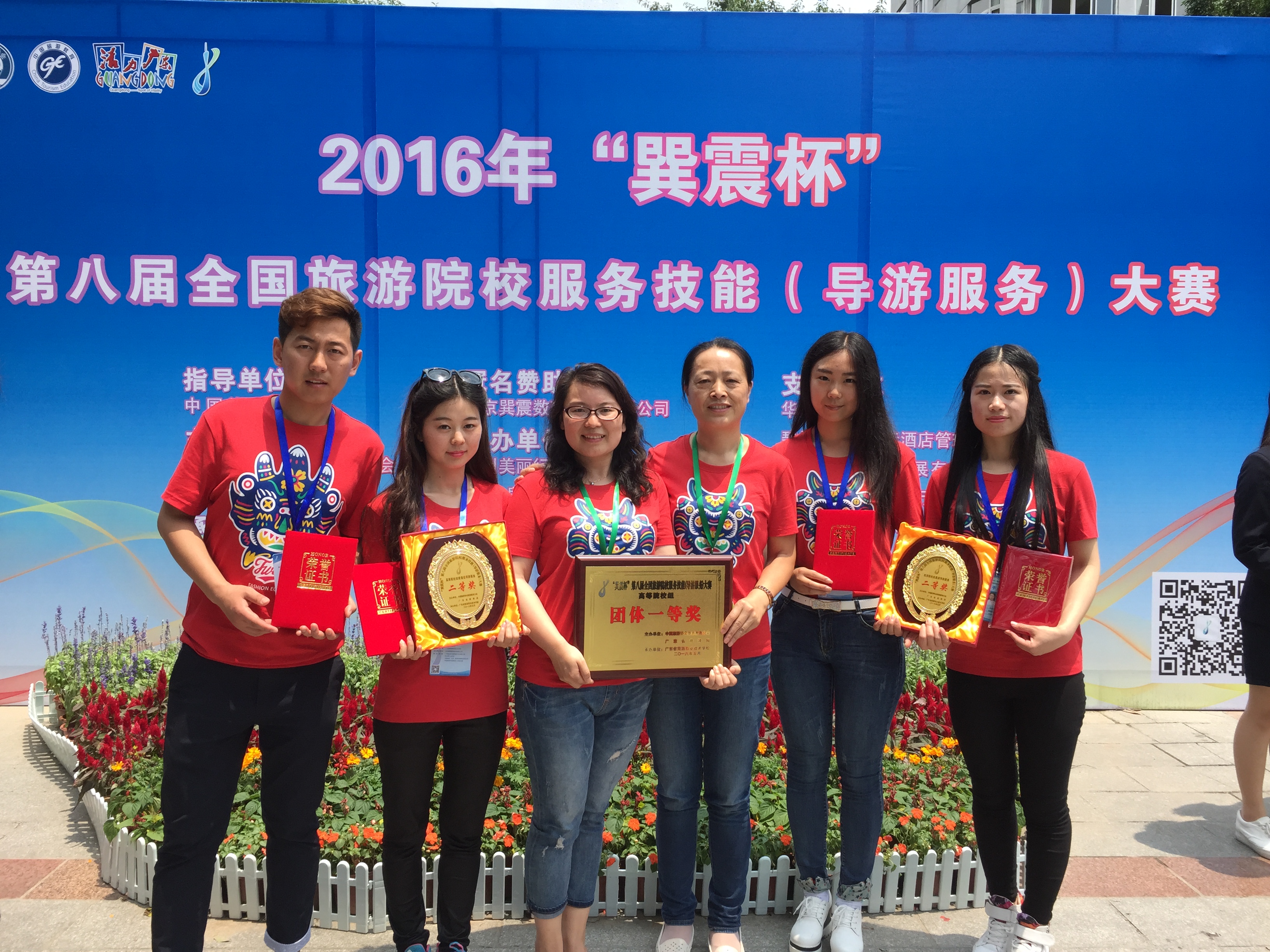 2016年5月12日至15日,bat365在线中国官网登录入口旅游管理专业教师郑金芳教授和易兰兰老师带四名旅游管理专业学生组成bat365在线中国官网登录入口代表队,在广州参加“巽震杯”第八届全国旅游院校服务技能(导游服务)大赛,经过理论考试、导游讲解、主题讲解、才艺展示四个环节的比赛,为我校赢得了团体一等奖;旅游管理2014级刘亚同学获普通话组个人二等奖、旅游管理2012的王金鑫同学获得普通话个人组三等奖;旅游管理2013级杜玉绥同学获英语组个人二等奖、旅游2013级李志颖同学获英语组个人三等奖;总成绩在335所院校中我校排第32名。