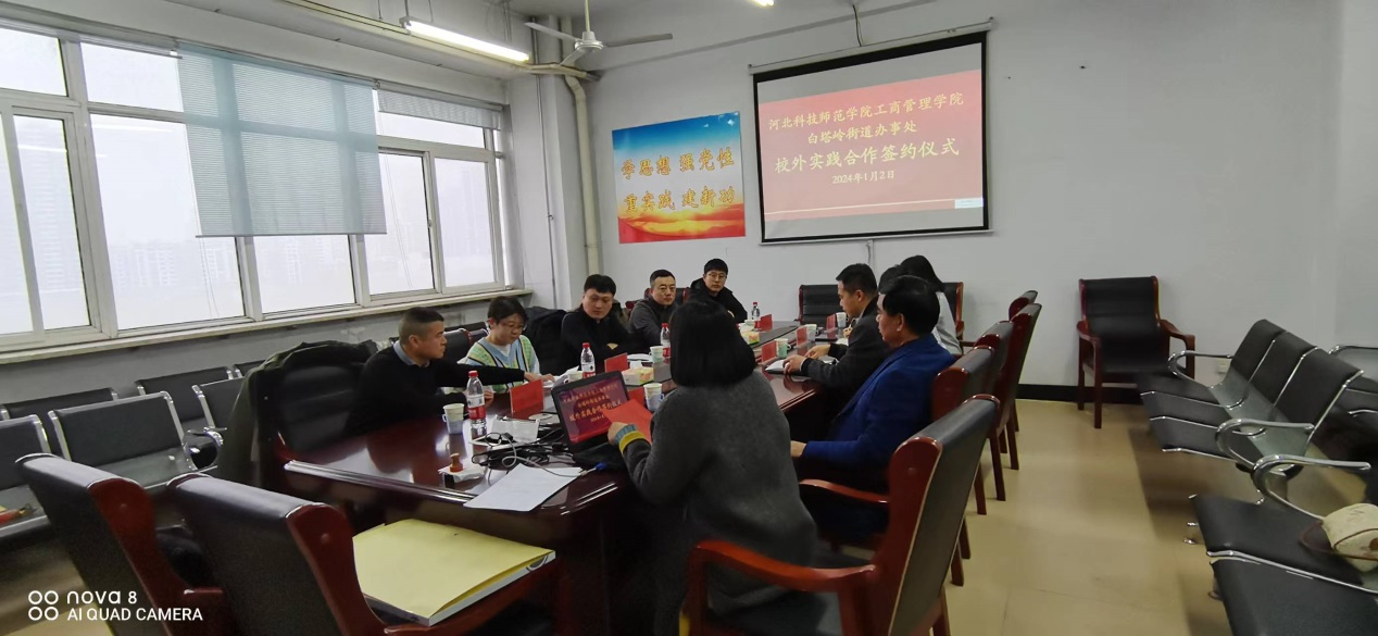 2024年1月2日下午,bat365在线中国官网登录入口bat365在线中国官网登录入口与秦皇岛市白塔岭街道办事处校外实践合作协议签约仪式在逸夫楼608会议室举行。出席本次签约仪式的有bat365在线中国官网登录入口领导班子成员及人力资源教学部教师代表,白塔岭街道办事处党工委书记、党工委副书记、办事处主任、组宣委员及党建办主任等五位领导。