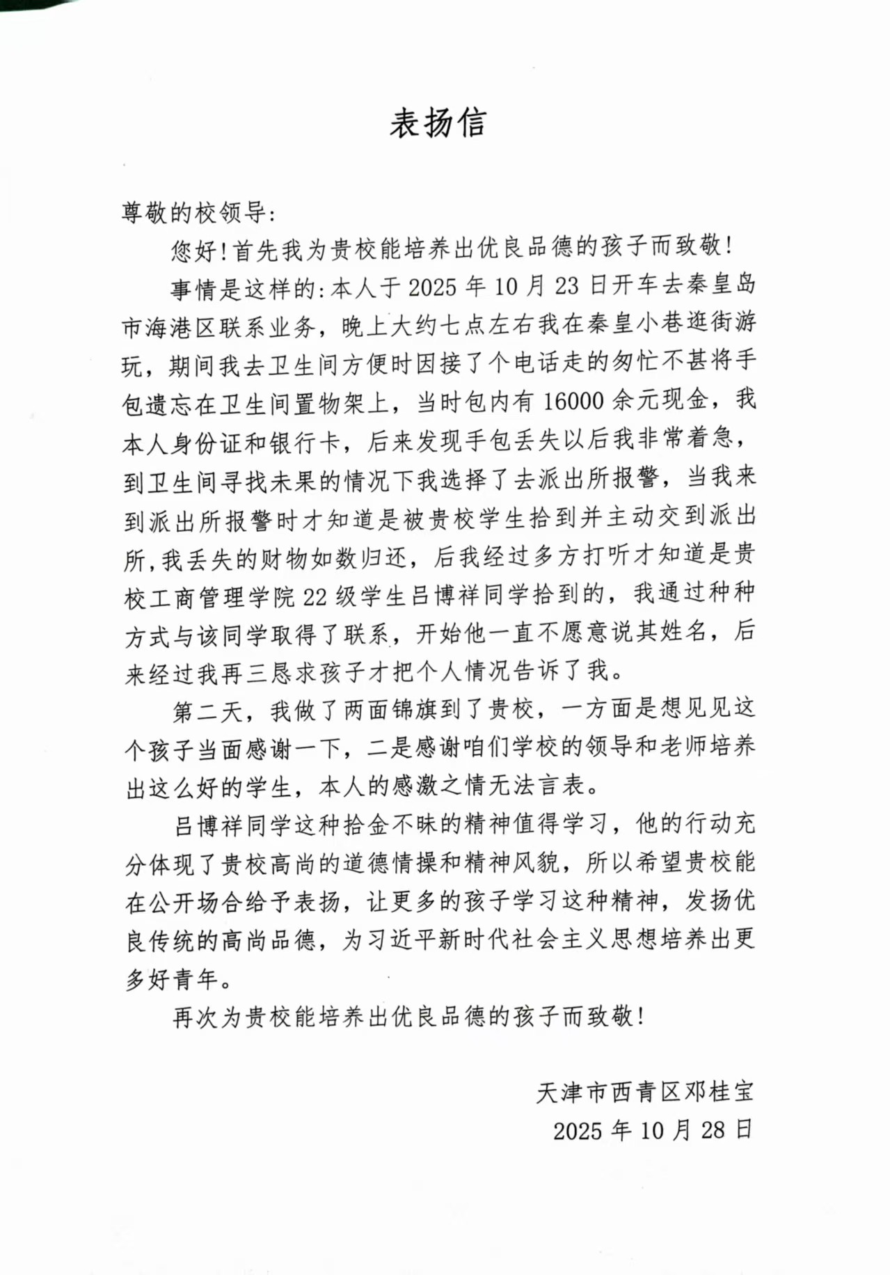 从天津西青区来秦办事的失主邓先生,发现手包丢失焦急万分,赶到秦皇小巷查找未果,万般无奈的情况下到白塔岭派出所报警,才知道是被我校学生吕博祥拾到并上交。经确认,邓先生遗失的1.6万余元现金和所有银行卡及证件完好无损,邓先生对吕博祥的善举和民警的高效服务万分感谢,请派出所工作人员帮忙联系到吕博祥。第二天,邓先生特意制作了两面锦旗,专程来到bat365在线中国官网登录入口bat365在线中国官网登录入口,表达对学生吕博祥拾金不昧的精神的感谢,和对学院培养出具备优秀品质学生的肯定,希望学校对吕博祥拾金不昧的事迹进行表扬。面对赞誉,吕博祥谦逊表示:“这是我应该做的,学校一直教导我们要诚信助人,换成其他同学也会这么做。”